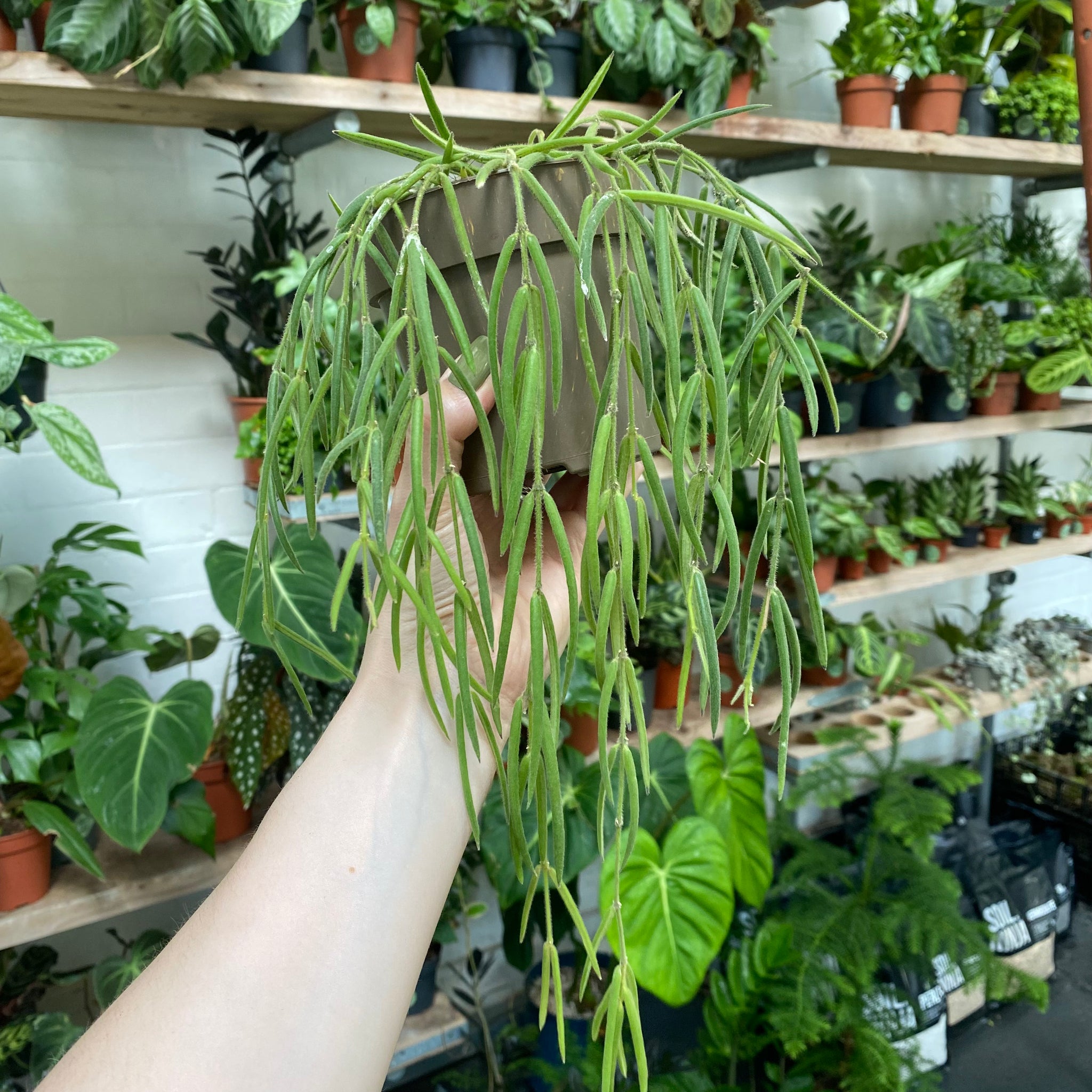 Hoya Linearis is one of our absolute favourites here at The Watered Garden; a plant that instantly brings the jungle into your home! The bright green succulent leaves, which are covered in fine hairs and resemble runner beans, cascade down delicate vines, and when mature, push out white star-shaped flowers that grow in clusters.