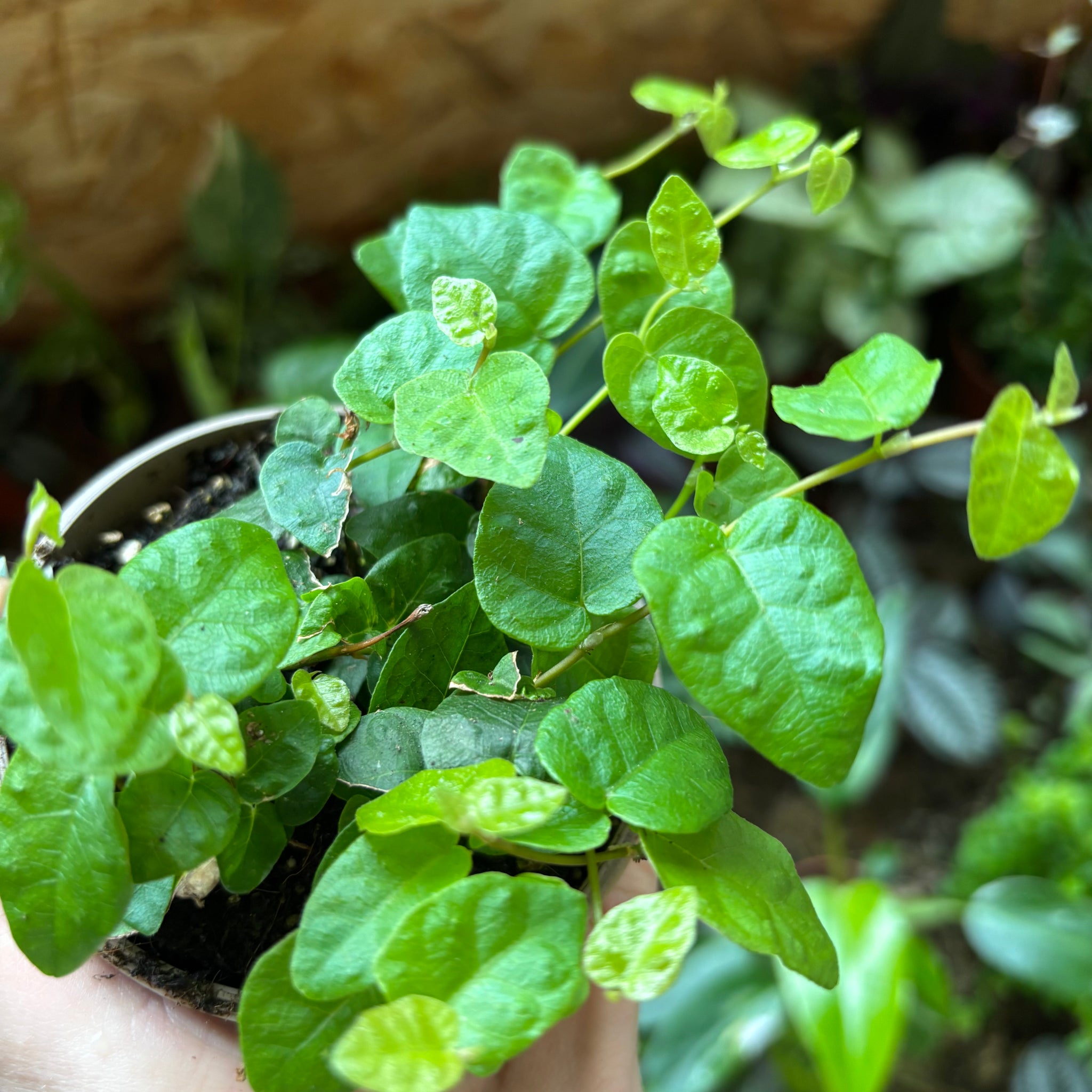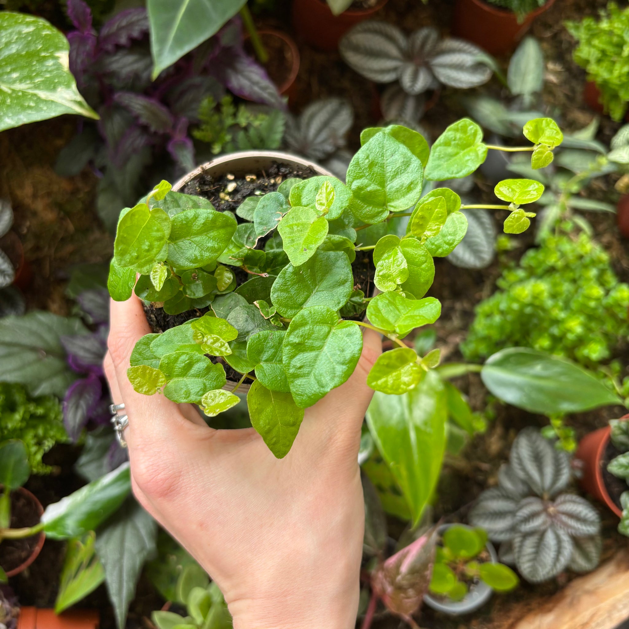 The Ficus Pumila, also known as the Creeping Fig, is a delicate plant perfect for terrariums or small shelves and hanging pots. Native to the temperate rainforests of East Asia, this Ficus likes it bright and humid and can be found growing off of other plants or rocks and cliffs in the wild. Its creeping nature makes it great for ground cover in terrariums, or growing up a piece of bark for a standout centre piece.